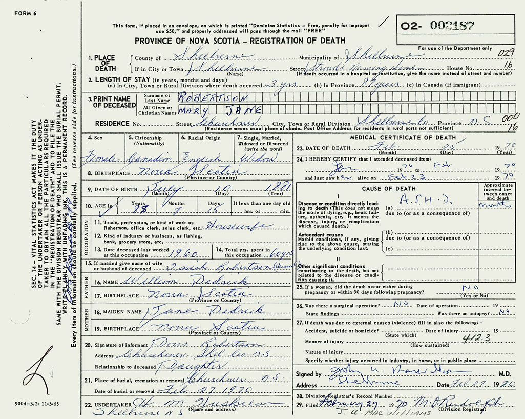 PROVINCE OF NOVA SCOTIA — REGISTRATION OF DEATH