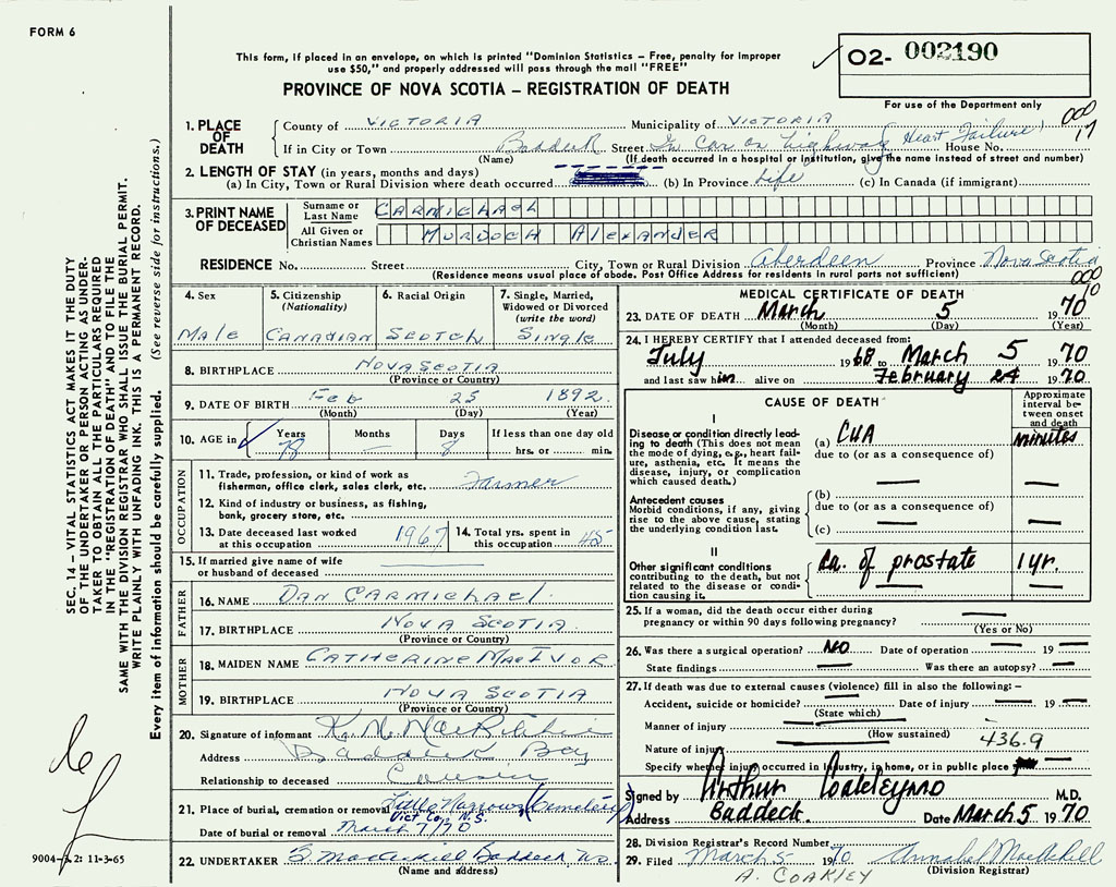 PROVINCE OF NOVA SCOTIA — REGISTRATION OF DEATH