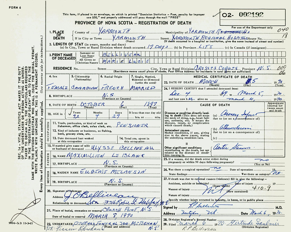 3. PRINT NAME OF DECEASED Belliveau, Marie Lucie