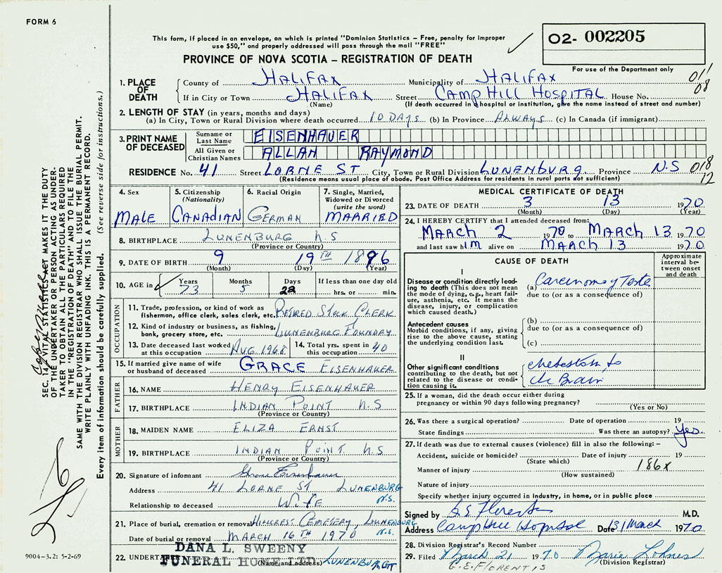 PROVINCE OF NOVA SCOTIA — REGISTRATION OF DEATH