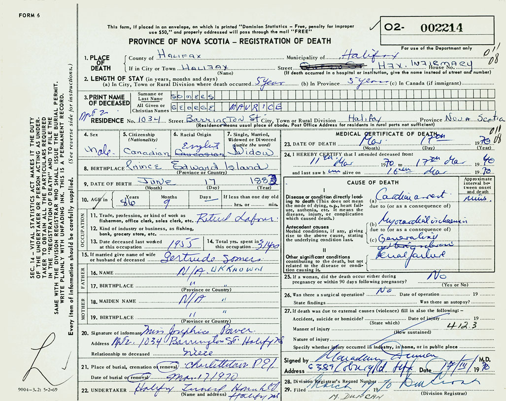 PROVINCE OF NOVA SCOTIA — REGISTRATION OF DEATH