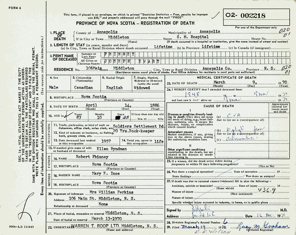 PROVINCE OF NOVA SCOTIA — REGISTRATION OF DEATH