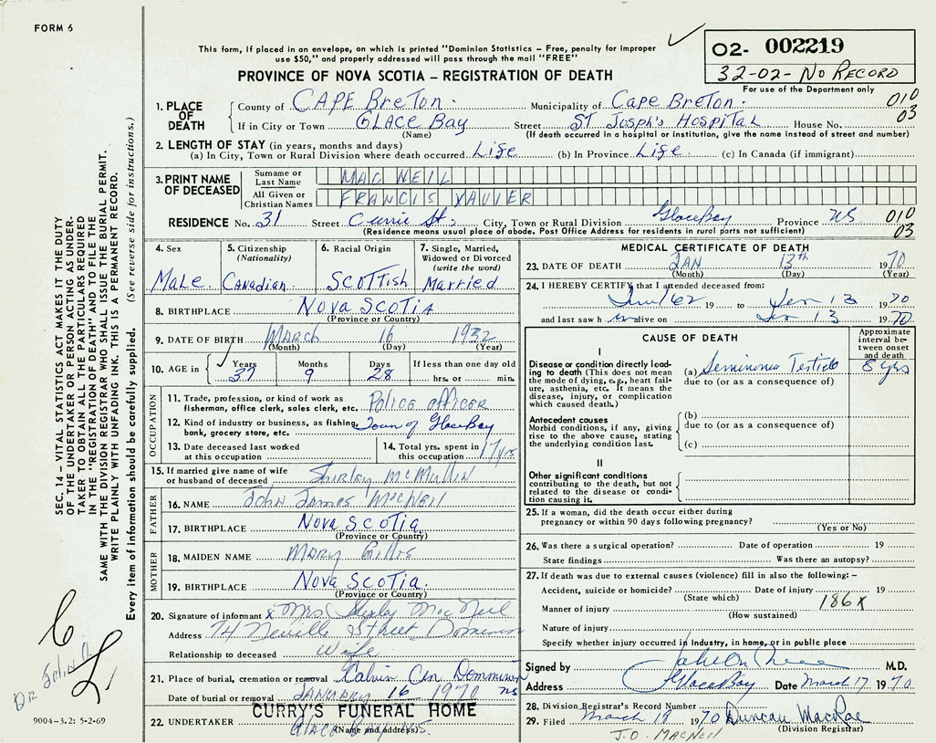 PROVINCE OF NOVA SCOTIA — REGISTRATION OF DEATH