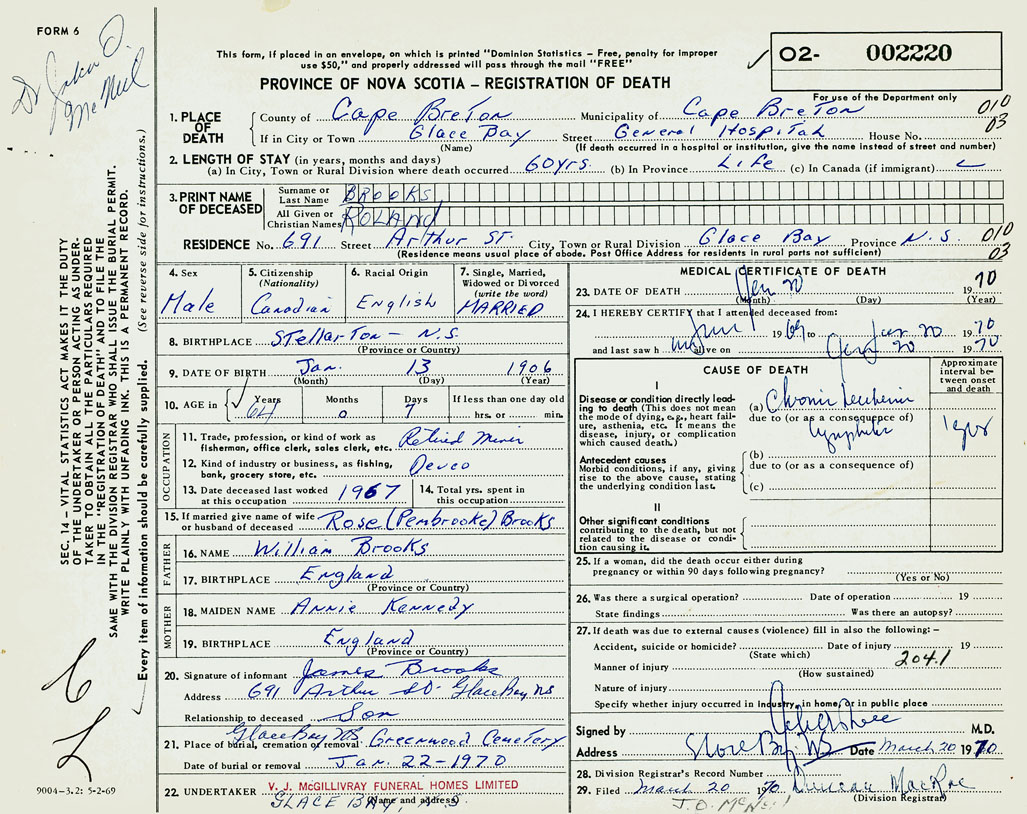 1. PLACE OF DEATH County of Cape Breton If in City or Town Glace Bay