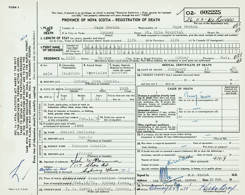 1. PLACE OF DEATH County of Cape Breton If in City or Town Sydney