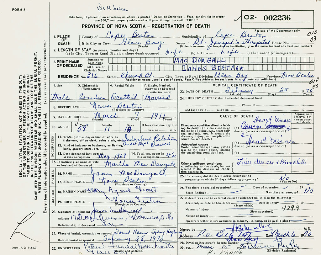 1. PLACE OF DEATH County of Cape Breton If in City or Town Glace Bay