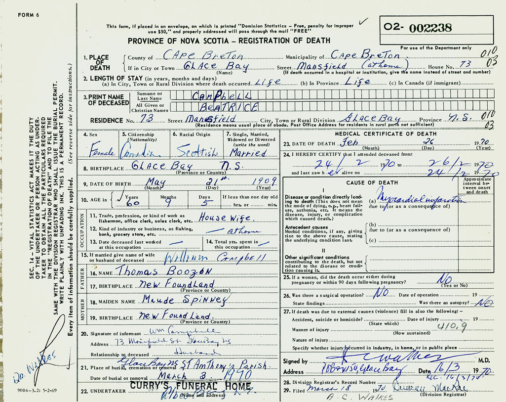 1. PLACE OF DEATH County of Cape Breton If in City or Town Glace Bay