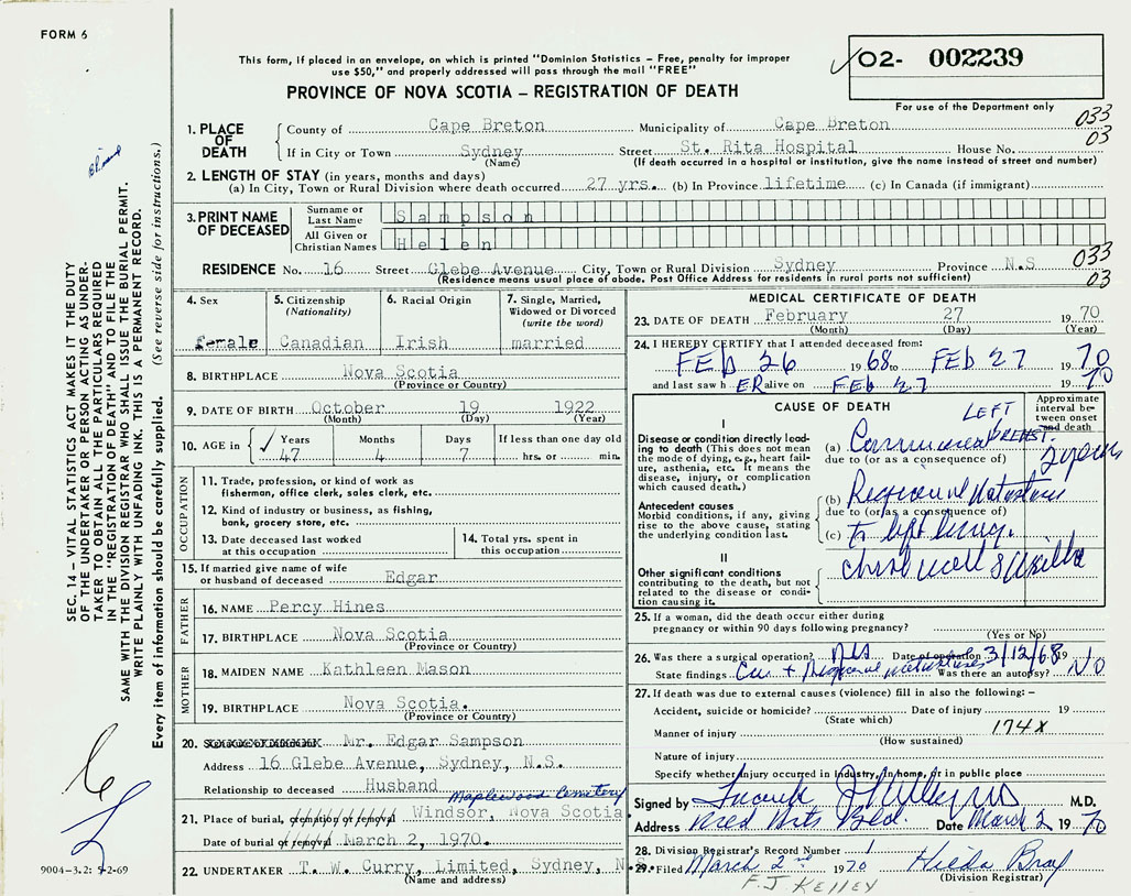 1. PLACE OF DEATH County of Cape Breton If in City or Town Sydney