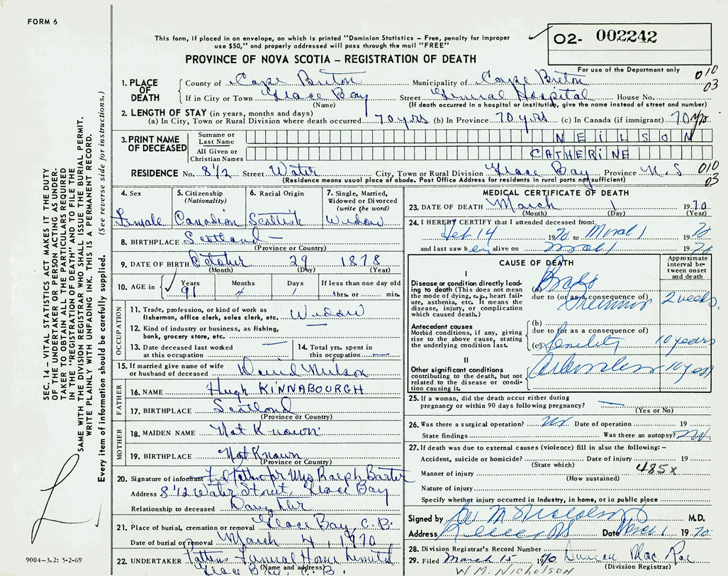 1. PLACE OF DEATH County of Cape Breton If in City or Town Glace Bay