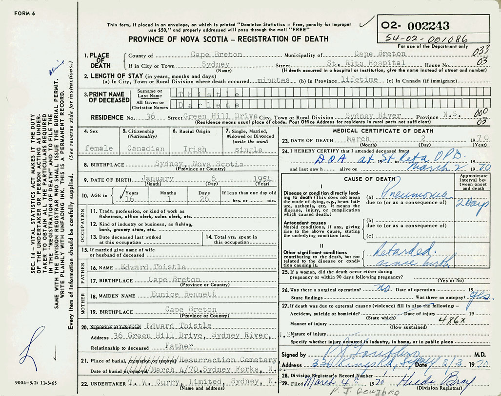 1. PLACE OF DEATH County of Cape Breton If in City or Town Sydney