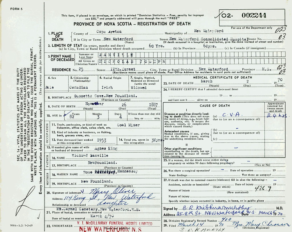 1. PLACE OF DEATH County of Cape Breton If in City or Town New Waterford