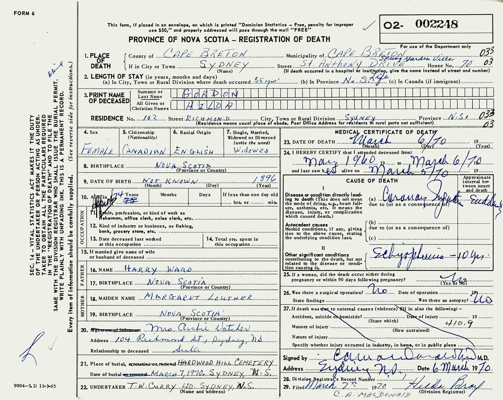 1. PLACE OF DEATH County of Cape Breton If in City or Town Sydney