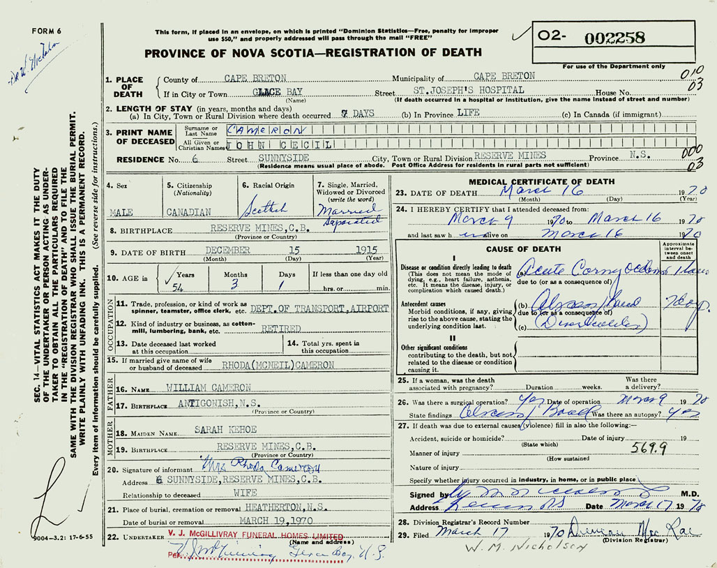 1. PLACE OF DEATH County of Cape Breton If in City or Town Glace Bay