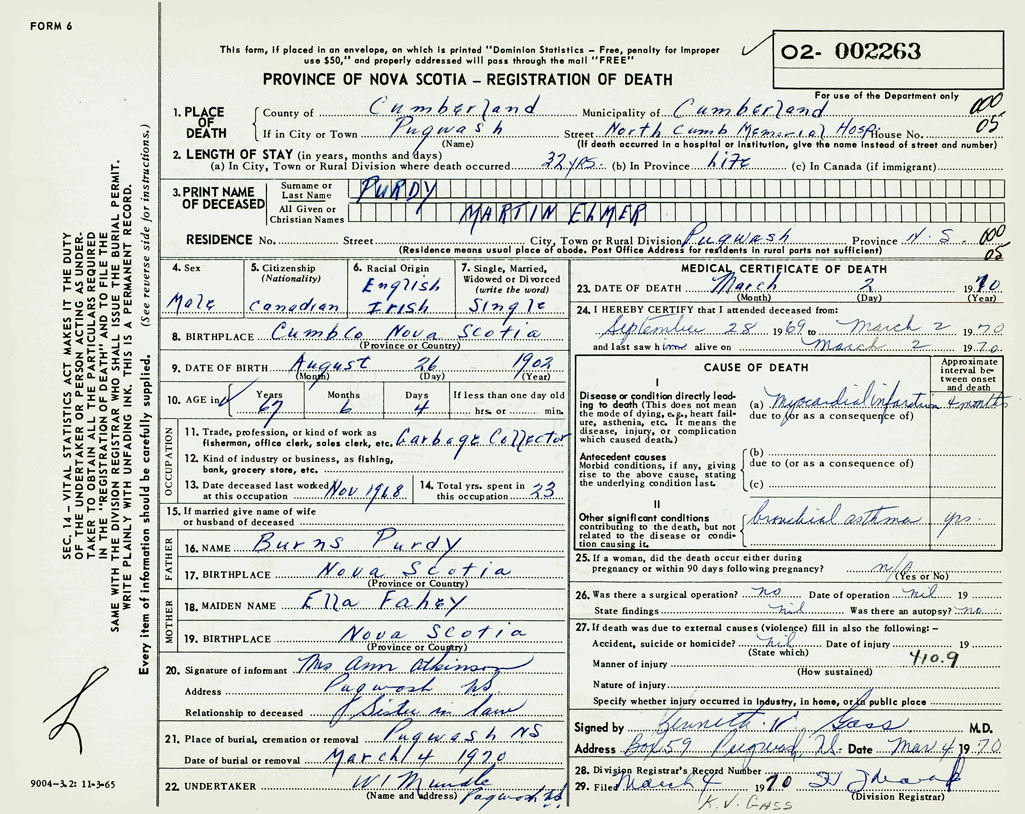 1. PLACE OF DEATH County of Cumberland If in City or Town Pugwash