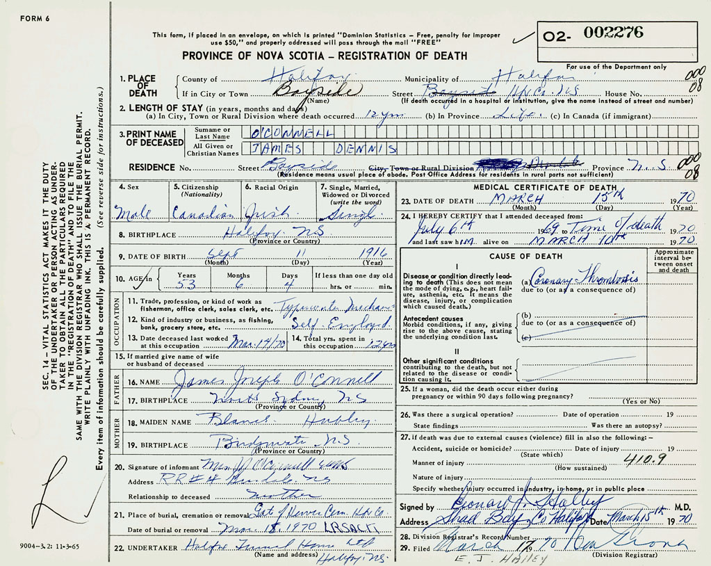 PROVINCE OF NOVA SCOTIA — REGISTRATION OF DEATH