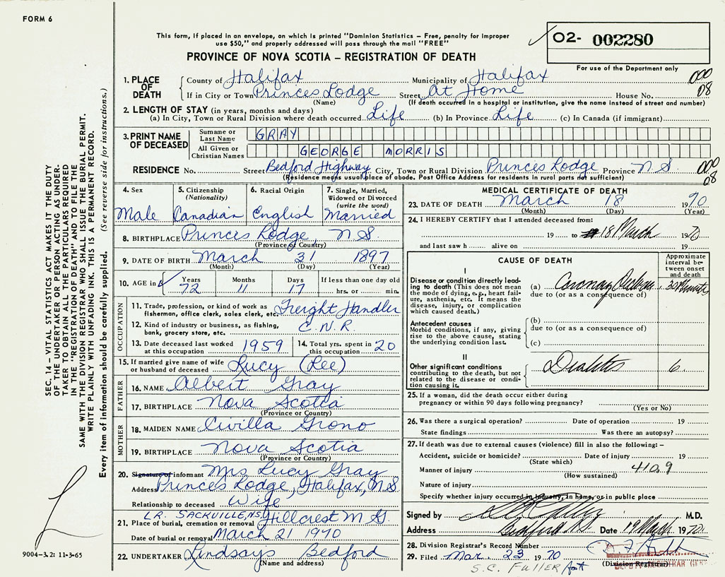 PROVINCE OF NOVA SCOTIA — REGISTRATION OF DEATH