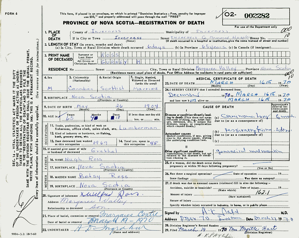 PROVINCE OF NOVA SCOTIA — REGISTRATION OF DEATH