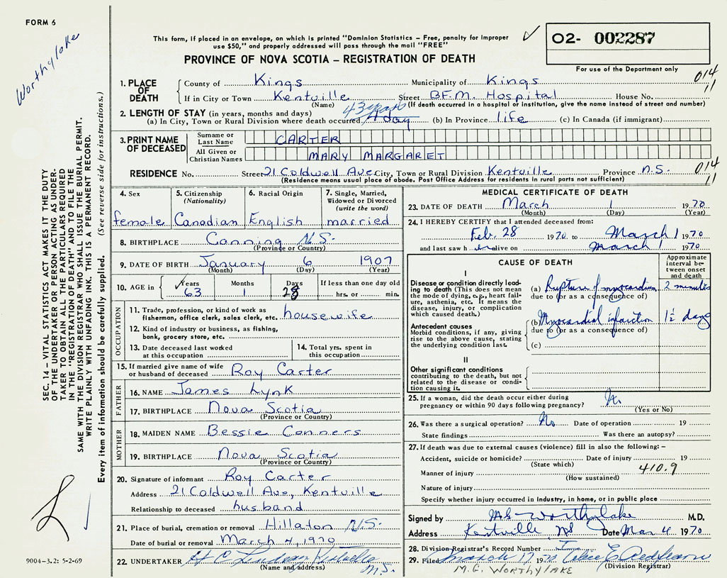 PROVINCE OF NOVA SCOTIA — REGISTRATION OF DEATH