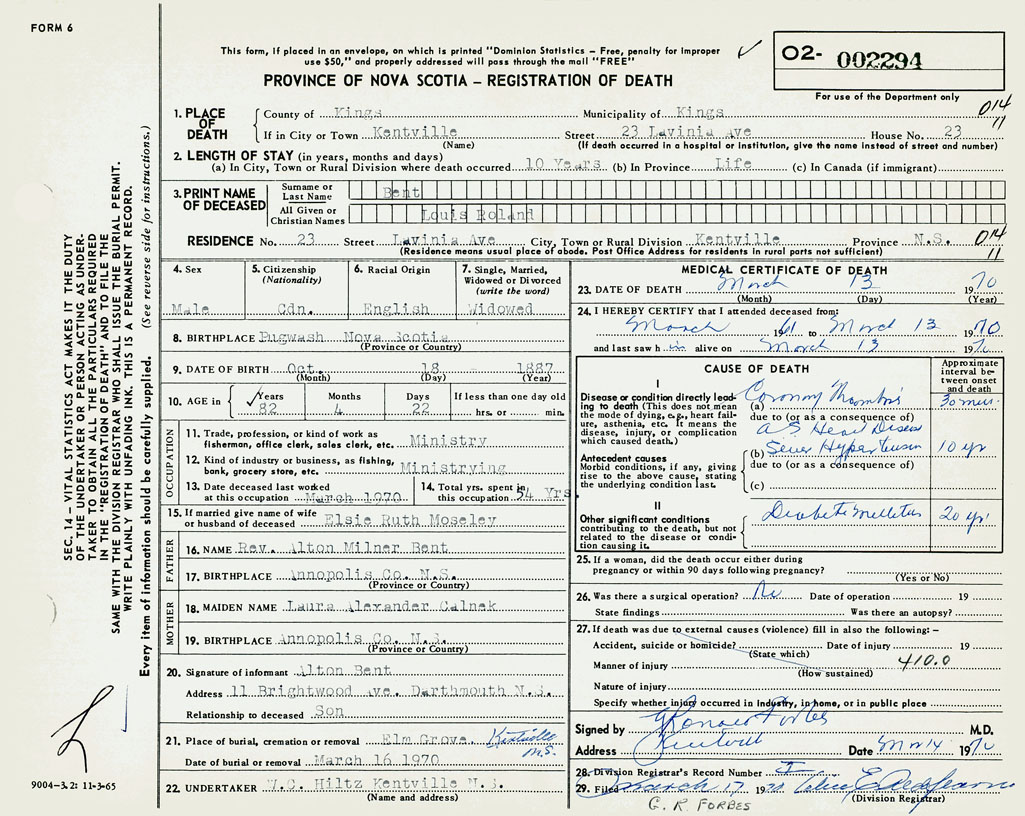 PROVINCE OF NOVA SCOTIA — REGISTRATION OF DEATH