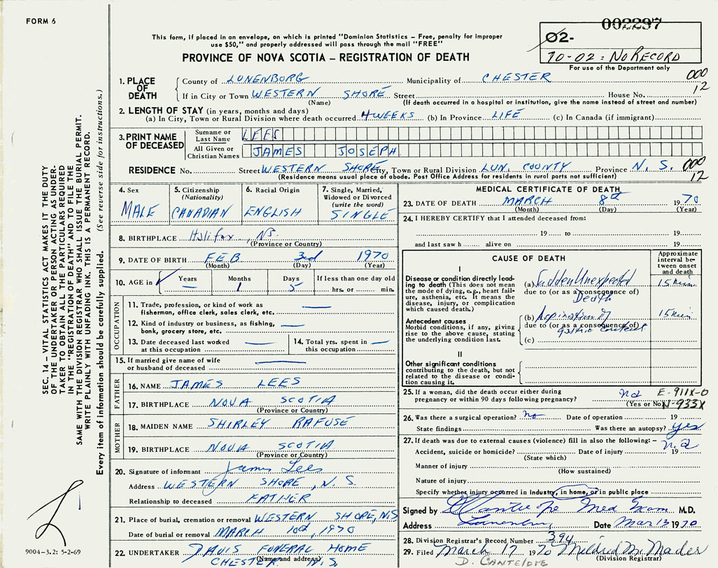 PROVINCE OF NOVA SCOTIA — REGISTRATION OF DEATH