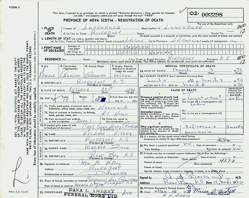 1. PLACE OF DEATH County of Lunenburg If in City or Town Riverport