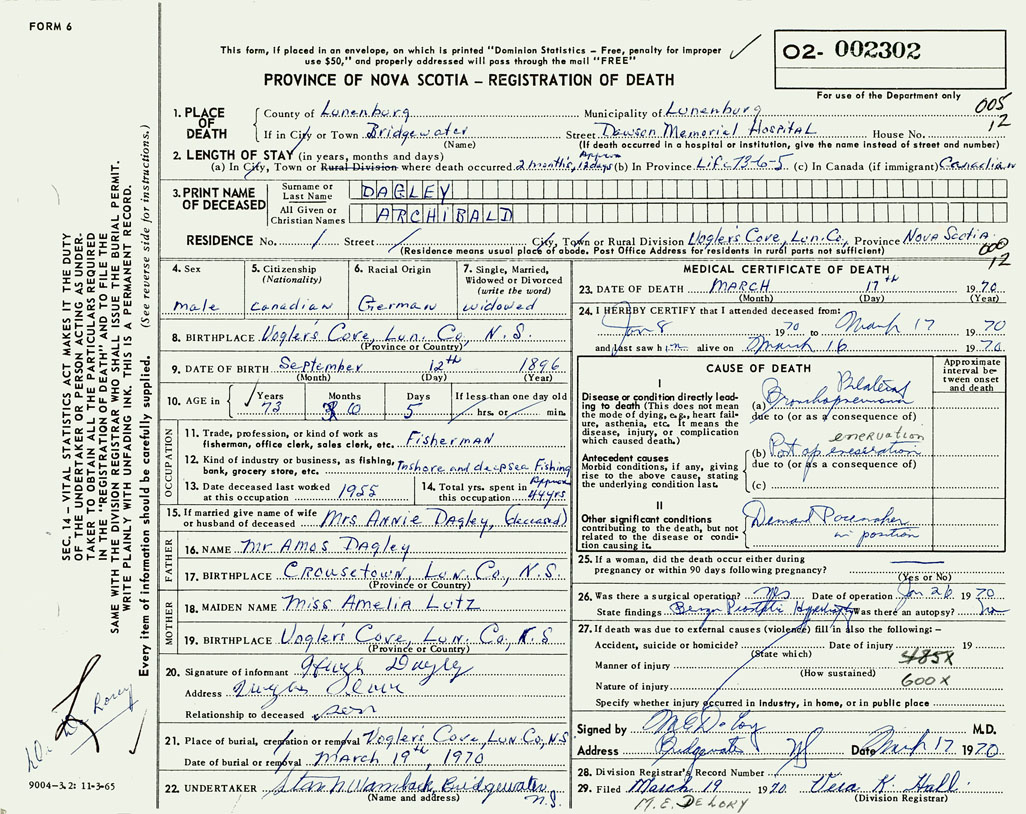 PROVINCE OF NOVA SCOTIA — REGISTRATION OF DEATH