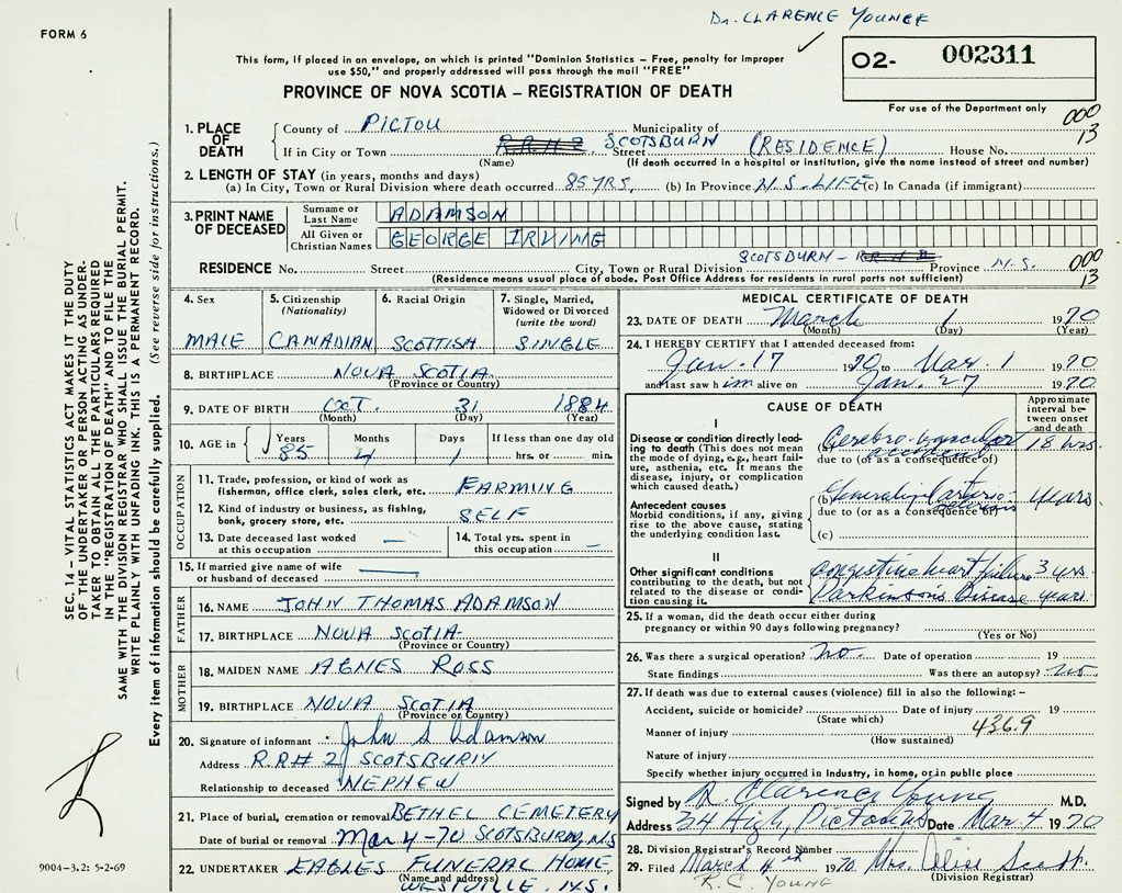 PROVINCE OF NOVA SCOTIA — REGISTRATION OF DEATH