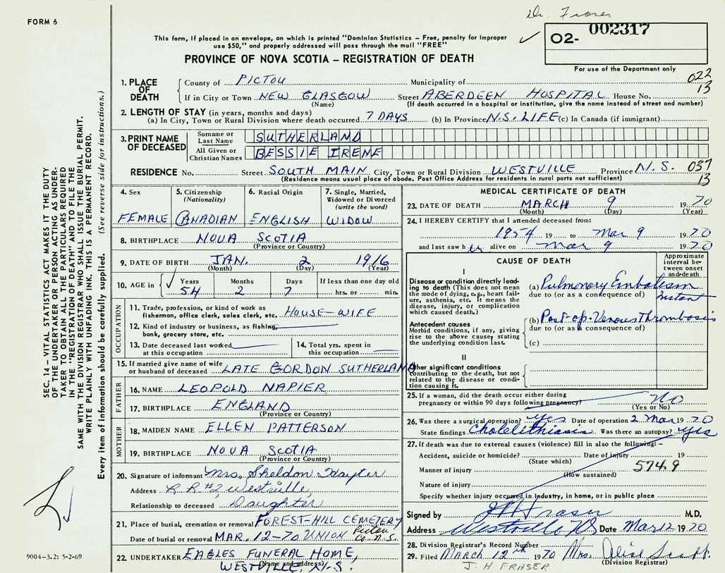 PROVINCE OF NOVA SCOTIA — REGISTRATION OF DEATH