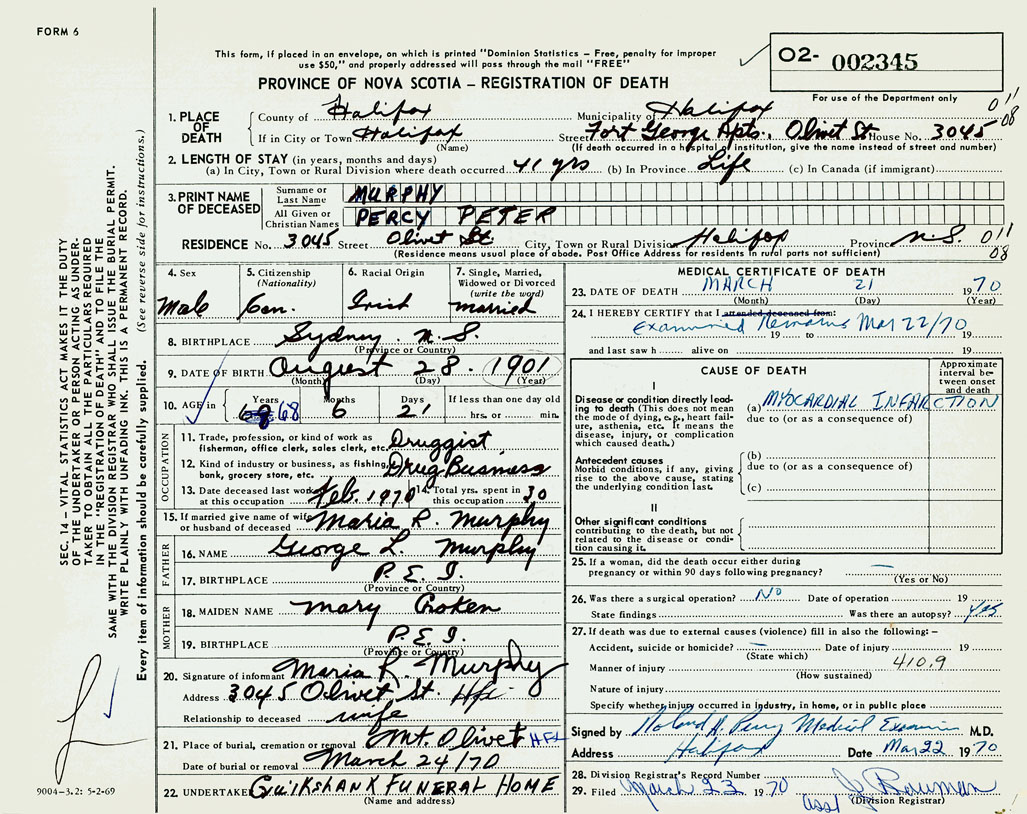 PROVINCE OF NOVA SCOTIA — REGISTRATION OF DEATH