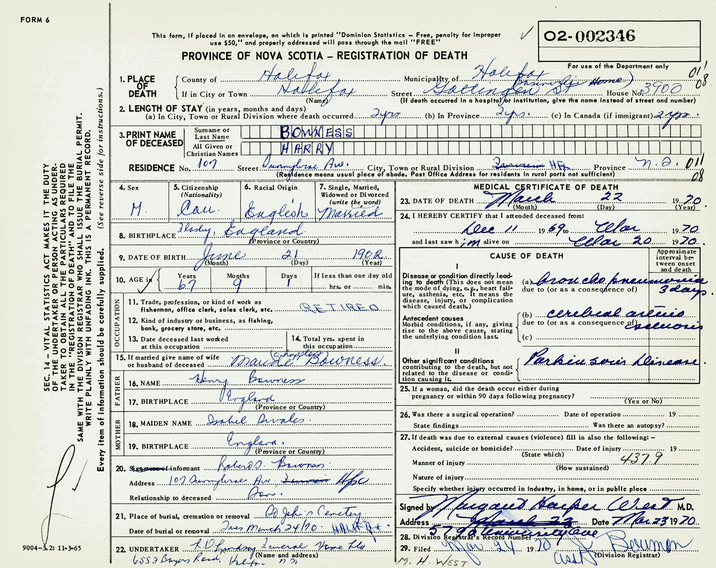 PROVINCE OF NOVA SCOTIA — REGISTRATION OF DEATH