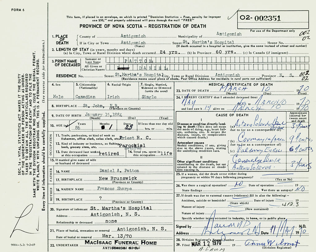 1. PLACE OF DEATH County of Antigonish If in City or Town Antigonish