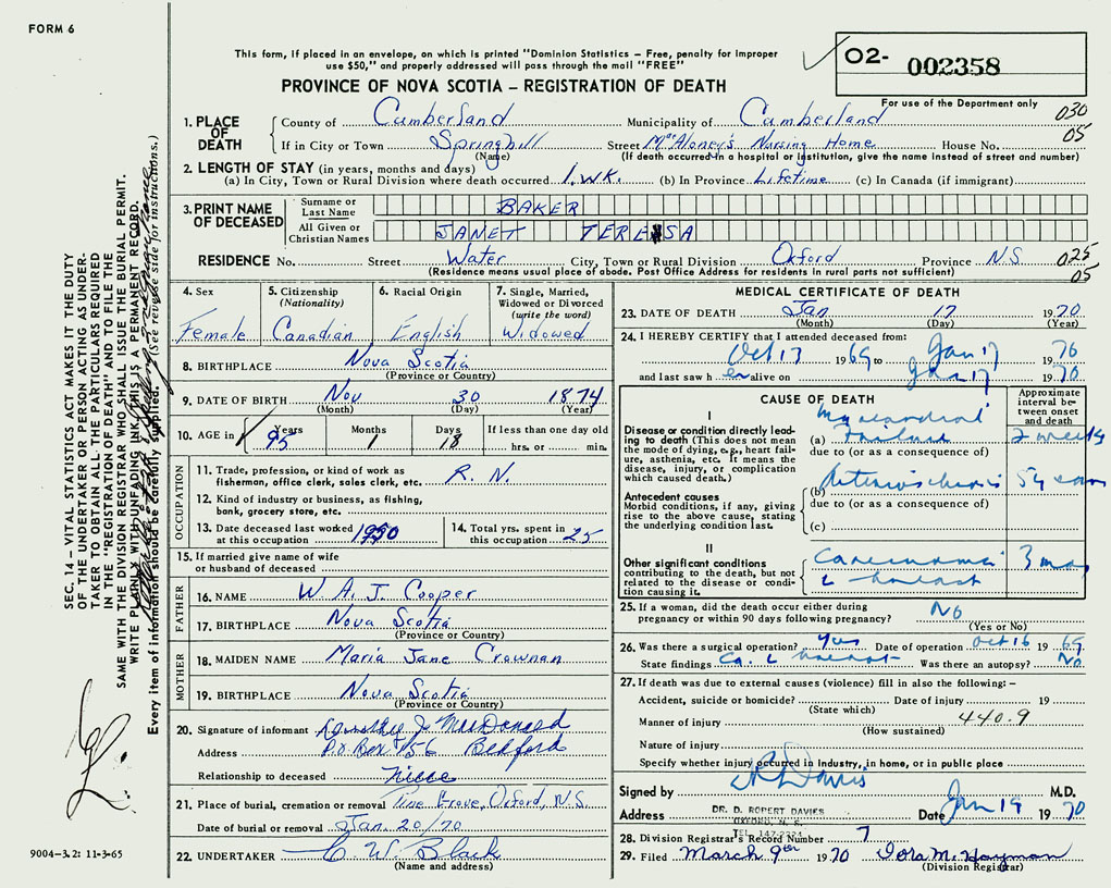PROVINCE OF NOVA SCOTIA — REGISTRATION OF DEATH