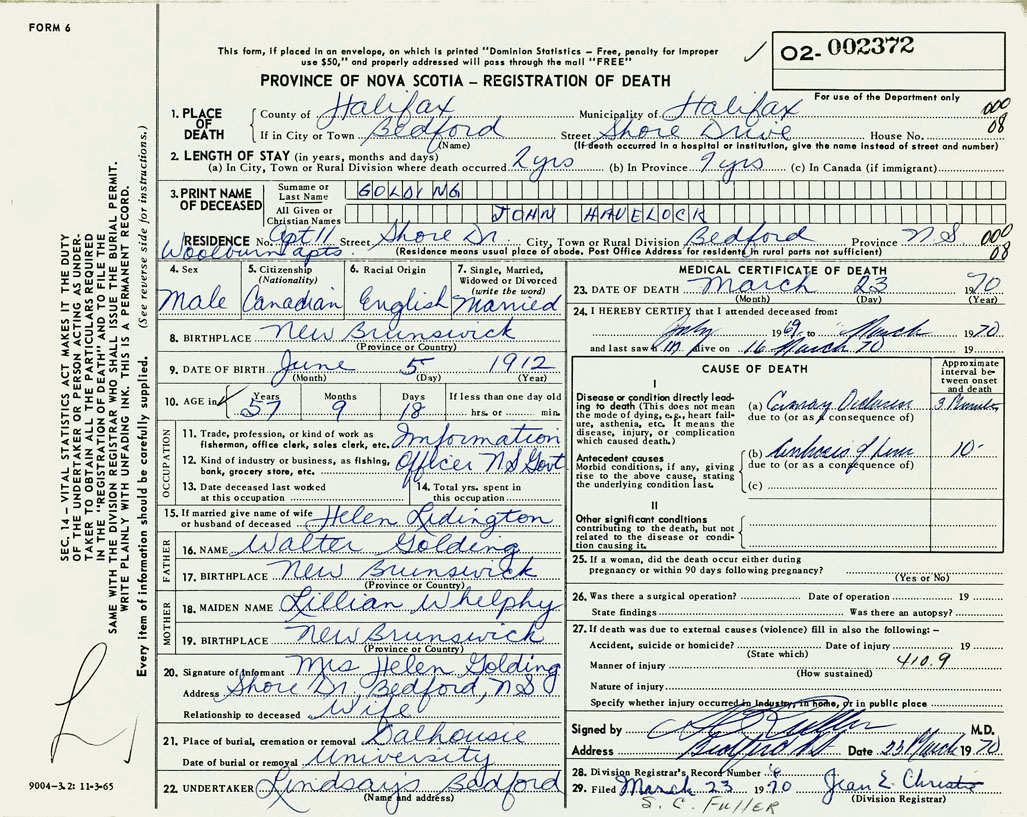 PROVINCE OF NOVA SCOTIA — REGISTRATION OF DEATH