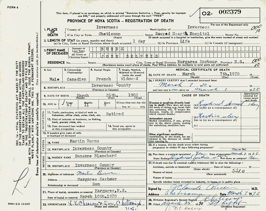 1. PLACE OF DEATH County of Inverness If in City or Town Cheticamp