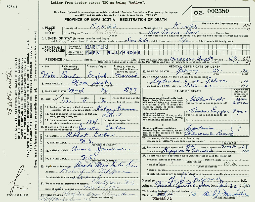 PROVINCE OF NOVA SCOTIA — REGISTRATION OF DEATH