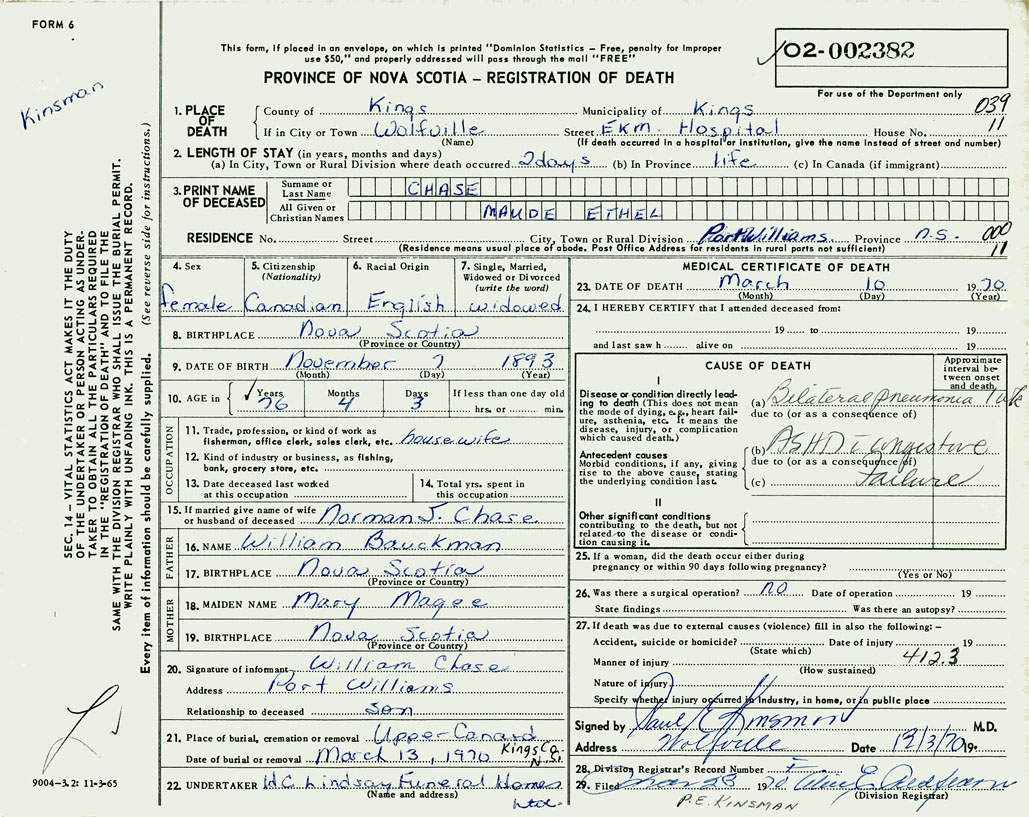 1. PLACE OF DEATH County of Kings If in City or Town Wolfville