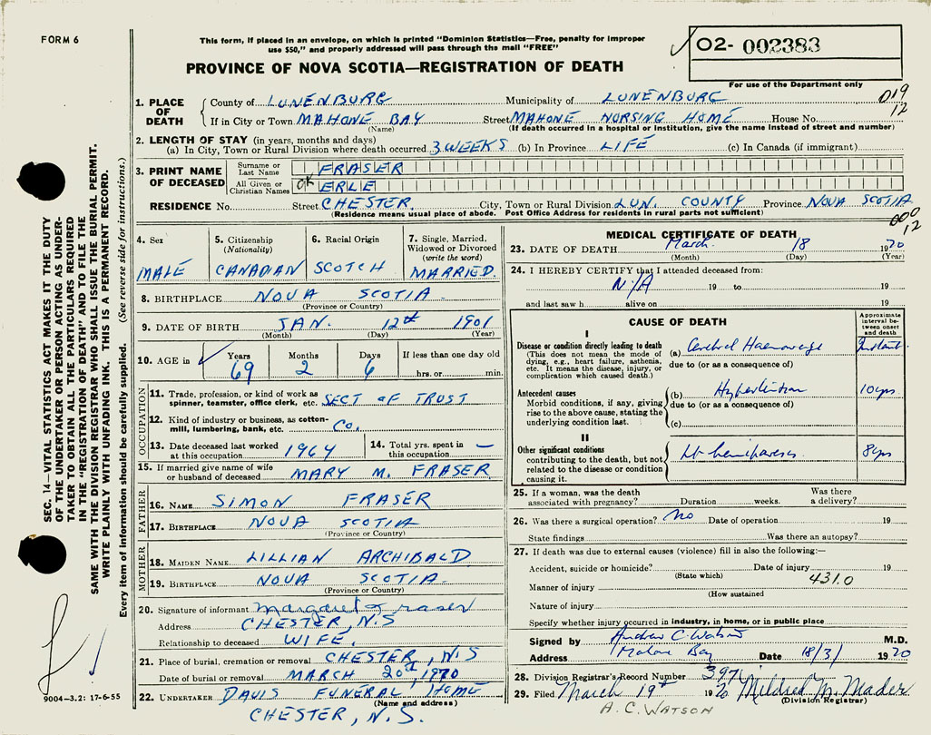 1. PLACE OF DEATH County of Lunenburg If in City or Town Mahone Bay