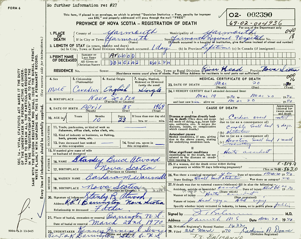 PROVINCE OF NOVA SCOTIA — REGISTRATION OF DEATH