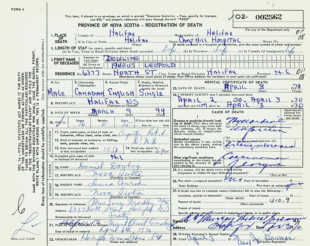 PROVINCE OF NOVA SCOTIA — REGISTRATION OF DEATH