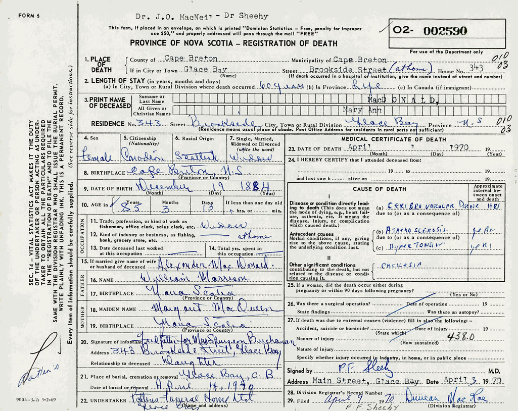 1. PLACE OF DEATH County of Cape Breton If in City or Town Glace Bay