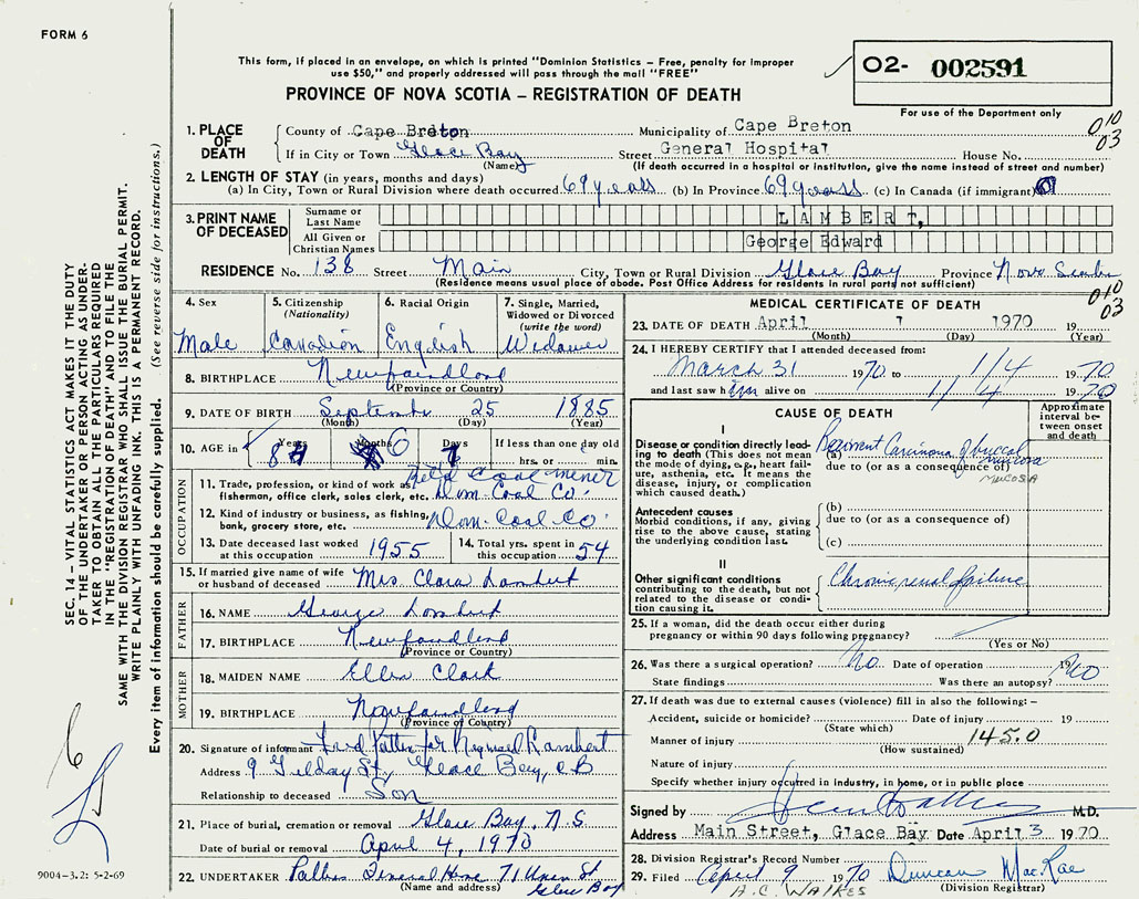 1. PLACE OF DEATH County of Cape Breton If in City or Town Glace Bay