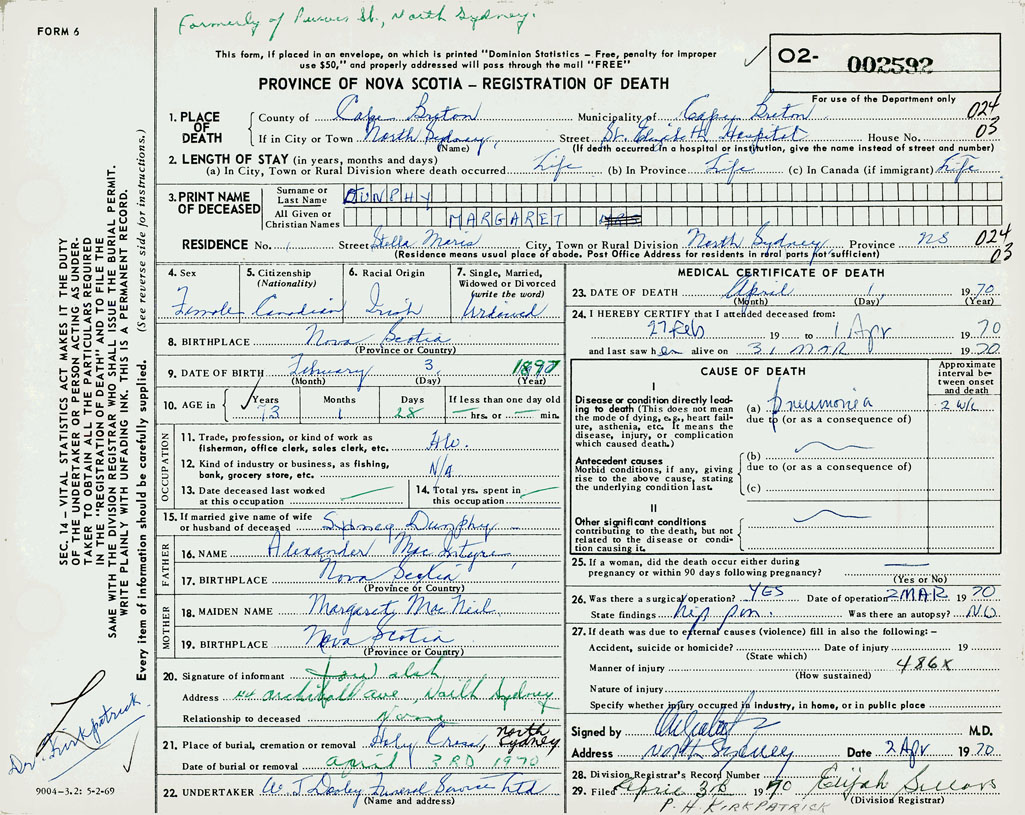 1. PLACE OF DEATH County of Cape Breton If in City or Town North Sydney