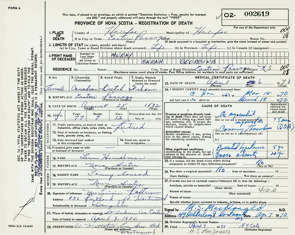 PROVINCE OF NOVA SCOTIA — REGISTRATION OF DEATH