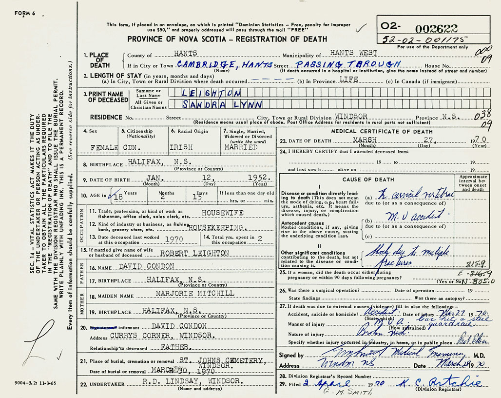 PROVINCE OF NOVA SCOTIA — REGISTRATION OF DEATH