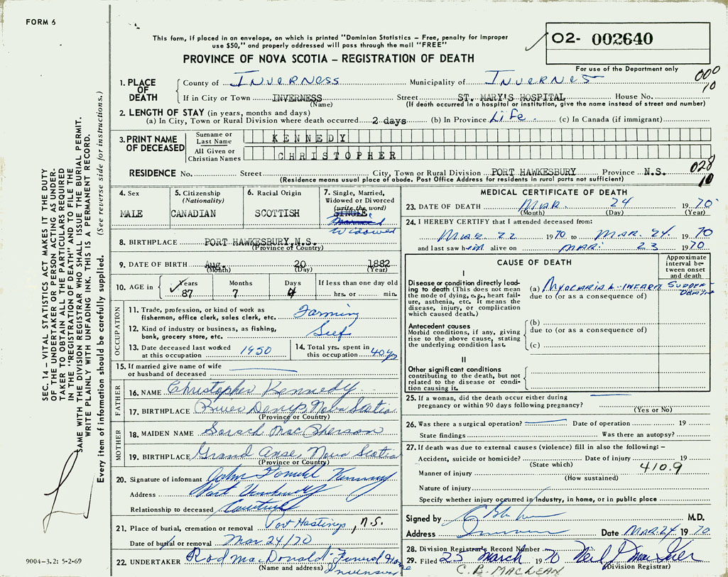 PROVINCE OF NOVA SCOTIA — REGISTRATION OF DEATH