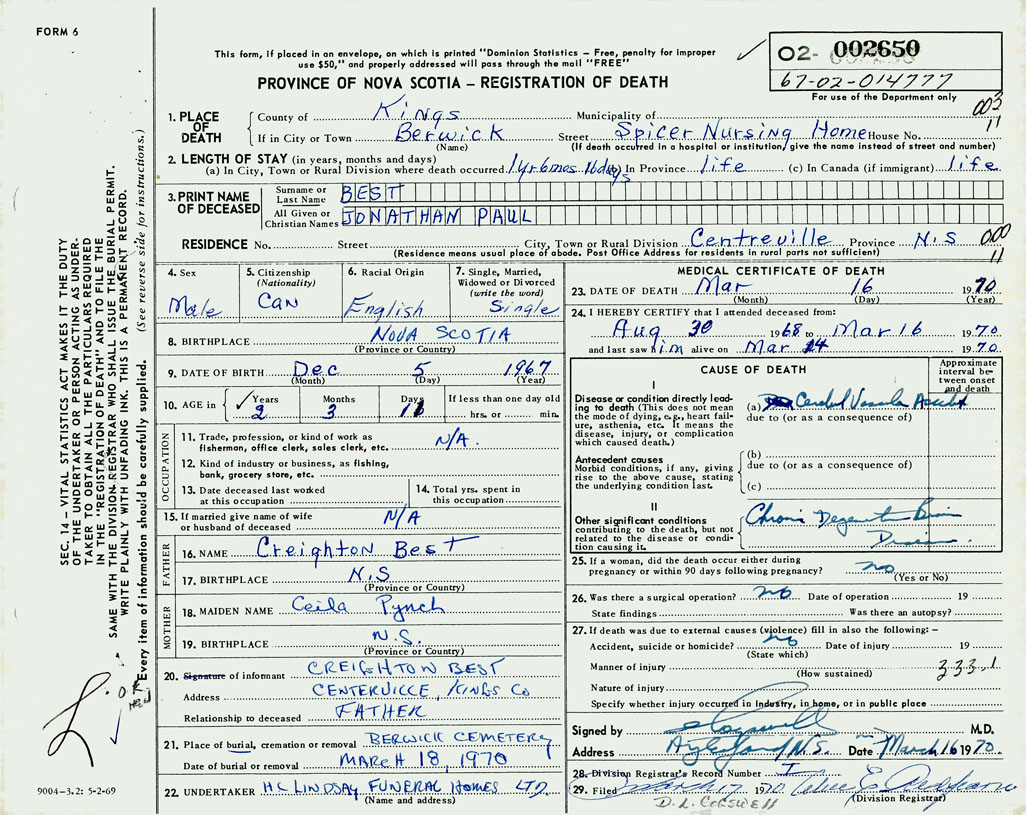 PROVINCE OF NOVA SCOTIA — REGISTRATION OF DEATH
