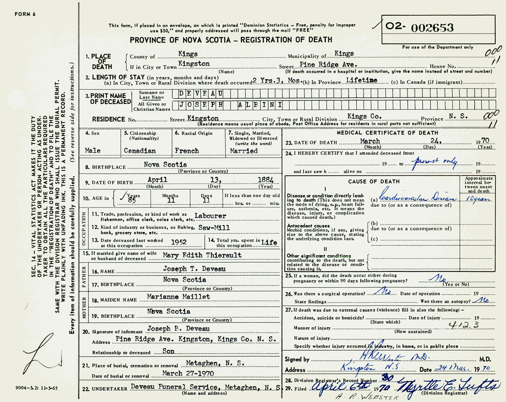 PROVINCE OF NOVA SCOTIA — REGISTRATION OF DEATH