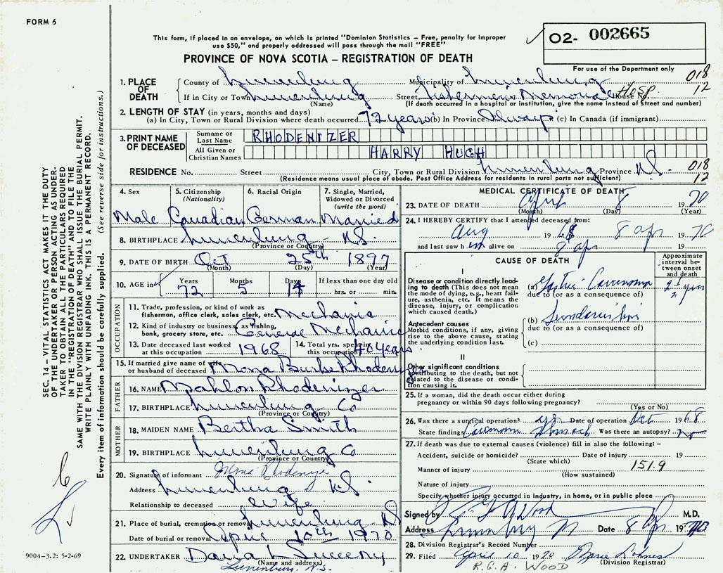 PROVINCE OF NOVA SCOTIA — REGISTRATION OF DEATH
