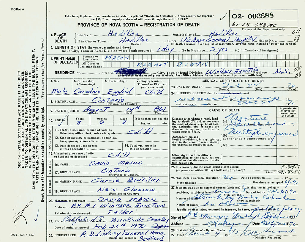 PROVINCE OF NOVA SCOTIA — REGISTRATION OF DEATH