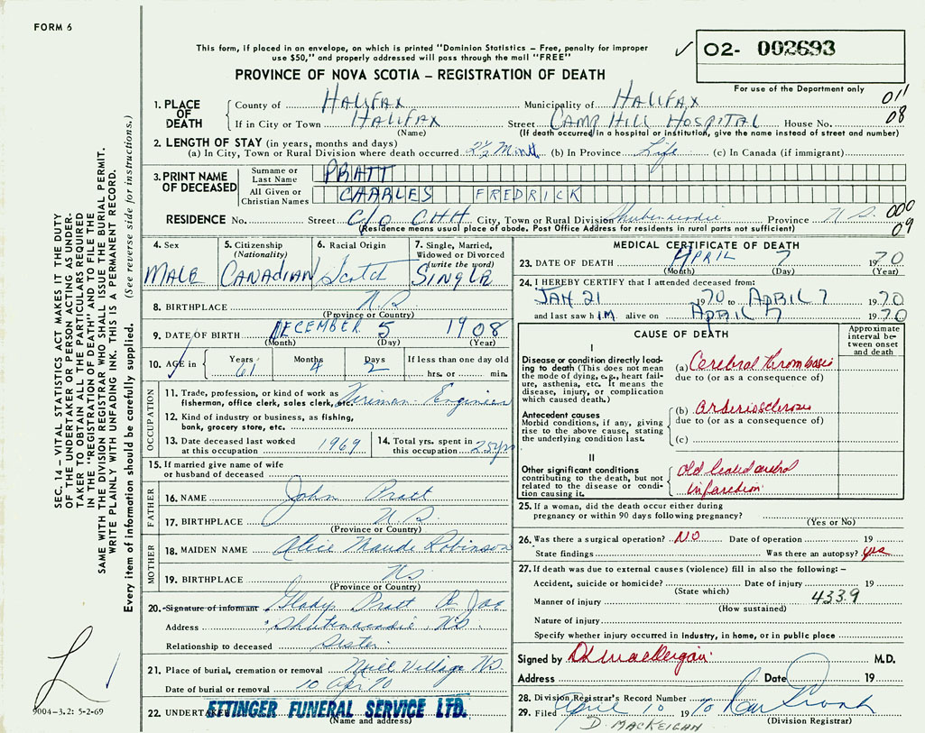 PROVINCE OF NOVA SCOTIA — REGISTRATION OF DEATH